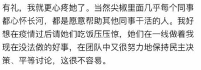 其次,尖椒部落有个规定,稿件完成后,交由其她编辑审阅校对后,才能发布。每个编辑都会校对别人的问题。几乎所有人都会遇到写稿卡壳的情况,难免会让其她审稿同事等待。即使深夜审稿校对,也算日常工作的一种。我有时候也会在深夜和法定休息日帮同事校对文章。我认为,这就是我作为尖椒部落一名普通编辑应该做的事情。没想到的是,我的主管居然把这种本职工作称为「善后」,不知道这人脑子里整天想的都是些啥,秉持的是什么样的价值观。