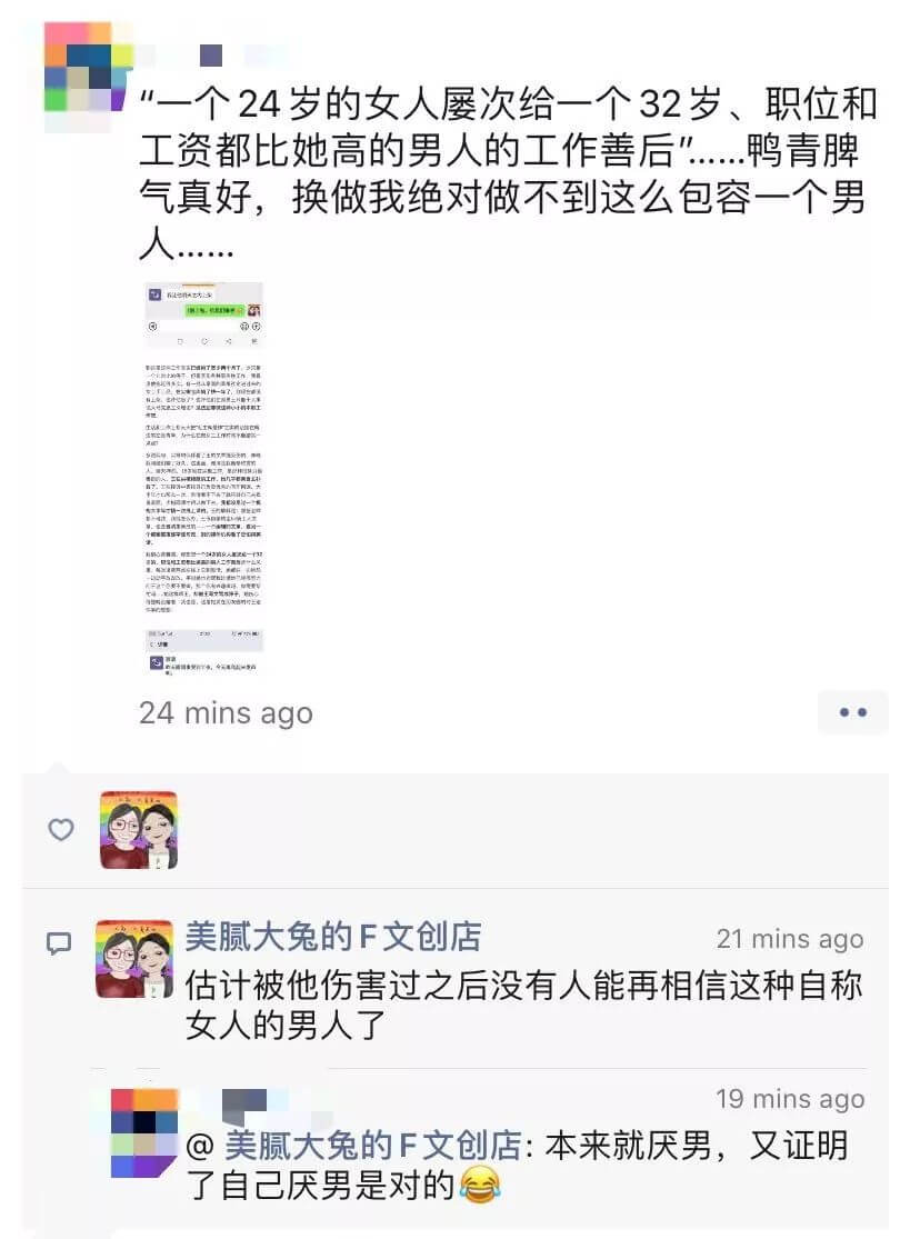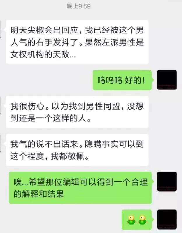 在我发出关于尖椒部落非法解雇我一事的两篇文章后,大兔和雅清,还有其她一些所谓的女权人士,在朋友圈和公众号上,发布了一系列回应。这些回应,没有答复我所质疑的任何问题,反而充斥了各种恶毒的谎言。俗话说,造谣一张嘴,辟谣跑断腿。但是,为了揭露这伙人的肮脏本质,我愿意辛苦一把,用事实回击她们的谣言。