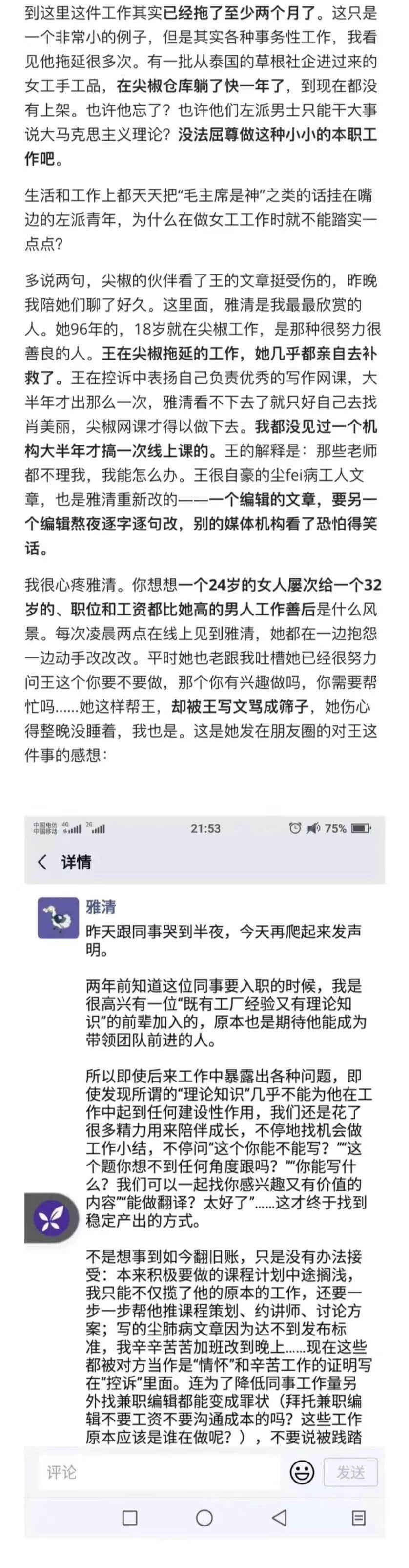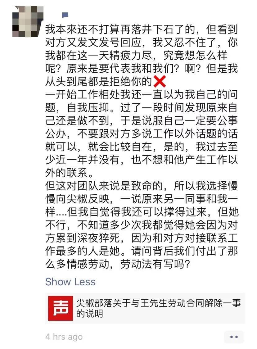 如果妳们不希望我留在尖椒部落是由于价值观,身份上的差异,大可以开诚布公地与我商谈,好聚好散,但是以见不得光的手段构陷我不能胜任工作,把我排挤出尖椒,这是我绝对不能接受的。妳们的做法,不仅践踏我作为劳动者的劳动付出,还跨越了「劳动法」规这一根本底线。