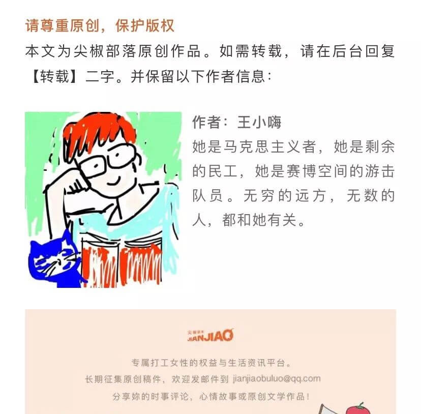 需要提及一个事情,这件事尤其暴露某些人的立场。我关注到打工诗人周启早的诗歌,想帮他代卖诗集,传播他的诗歌,其实也就是弘扬尖椒部落的理念。所以我拍了照,制作了宝贝详情,但遗憾的是因为许可证的原因没有上架成功。后来,我给诗人周启早的书打包、发货与统计情况,同事们都看在眼里,我也跟他们分享了上架失败的事情,希望她们给一些建议。结果,一位同事看到后说:妳做这些,能给尖椒带来什么?我心里瞬间一万只草泥马飘过。帮助打工诗人传播她们的诗歌,不是我们最基本的责任和义务吗?投资人给我们机构资金,不是让我们去传播工人文化,难道是让我们去赚钱的吗?尖椒部落充斥着这种毫无阶级意识,毫无劳工意识的混混,违法解雇员工也就不奇怪了。