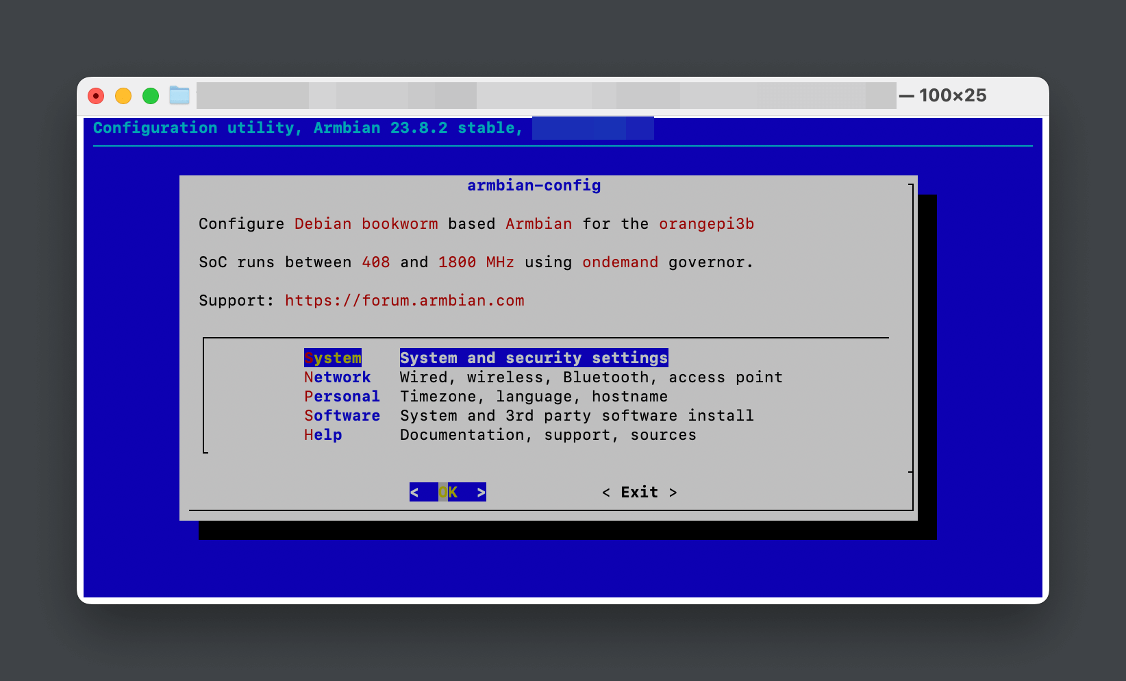 armbian的root默認密碼為1234,根據提示選擇終端類型與語言、地區等,修改默認root密碼以及創建新用戶。完成初始化設置之後,在終端鍵入命令,進入armbian的設置介面。