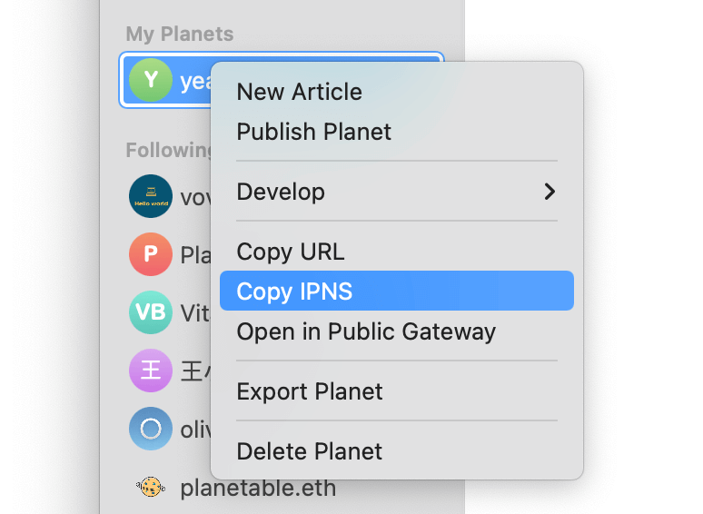 发布完第一个篇文章之后,妳的 Planet 就会被发布为一个 IPNS。右键点击侧栏里你的站点,选择 Copy IPNS。然后你就会在剪贴板中获得像这样的一串东西:
