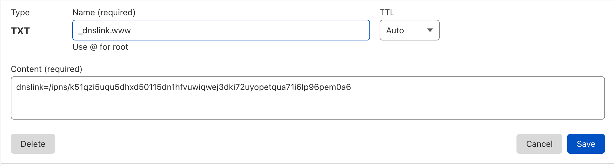 绑定传统域名,需要使用的是DNSlink服务,大概的意思就是在DNS上写入txt记录,以供读取。因为使用到传统的DNS服务,所以IPNS关联到传统域名,并非是一个去中心的解决方案。