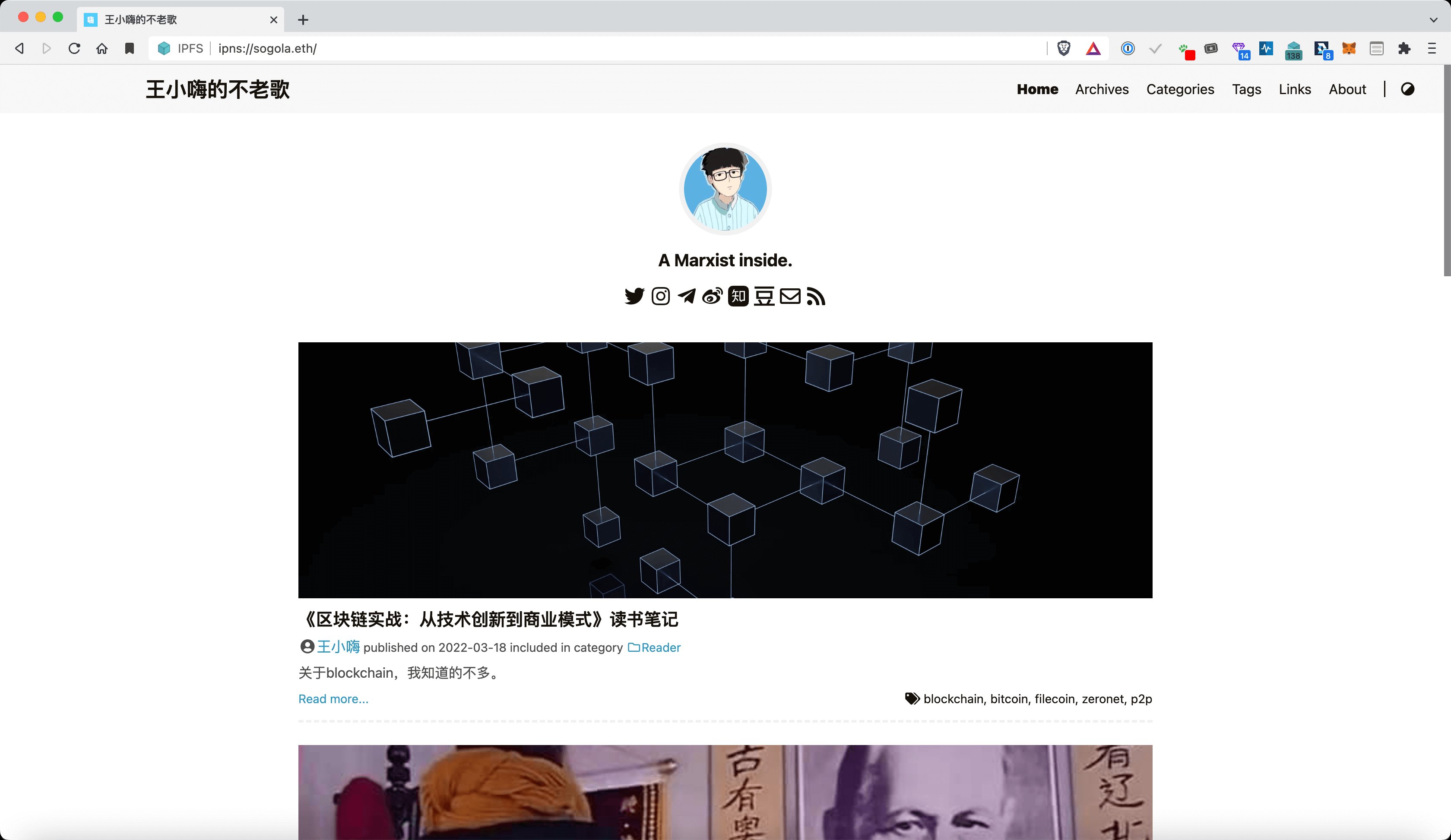 在原生支持IPFS的Brave浏览器里,你甚至可以用 ipns://sogola.eth 这样的地址直接打开妳的IPFS站点。